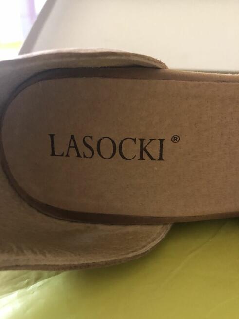 Buty eleganckie modny design. Z paseczków na lato, wysoka koturnach, prawie nie używane. Firma Lasocki. Kolor bez. Możliwa ...